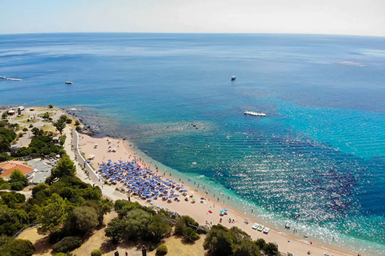 La spiaggia dista 200m dal resort ed è caratterizzata dai piccoli sassolini colorati, attrezzata con ampia disponibilità di ombrelloni, lettini e sdraio ad esaurimento. Si raggiunge tramite una scalinata che dal resort scende al mare. A 900 metri dalla struttura, la Bau Bau Beach, spiaggia riservata ai nostri amici a quattro zampe.