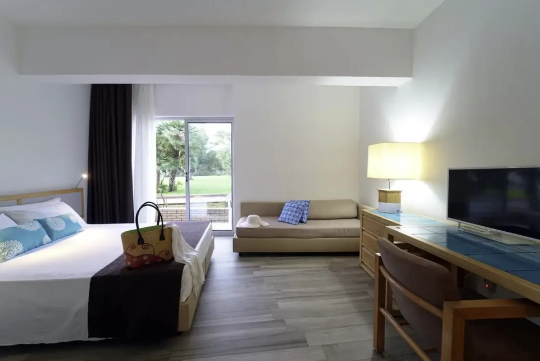 Le camere, collocate nelle tre strutture a forma di semicerchio e sono circondate da spazi verdi. dispongono tutte dotare di tv, cassetta di sicurezza, frigobar, telefono, aria condizionata, servizi con vasca e asciugacapelli, balcone.