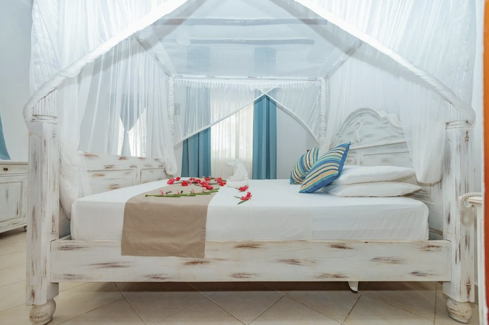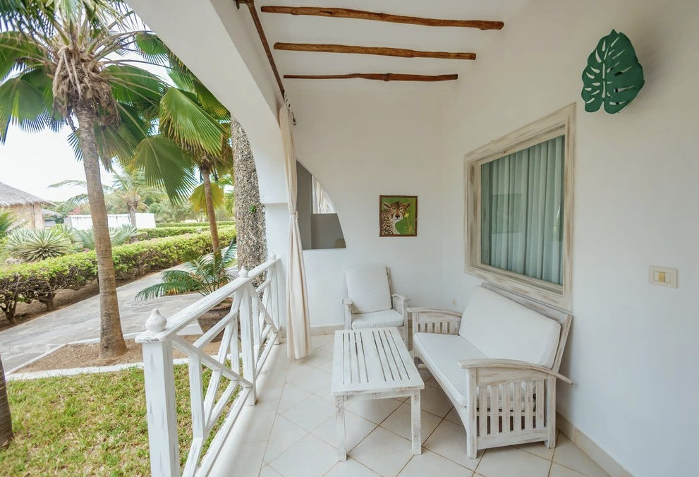 Le 64 camere sono realizzate in stile arabeggiante, situate in due palazzine a due piani; tutte dispongono di aria condizionata, ventilatore a soffitto, letto a baldacchino con zanzariera, TV, cassaforte, asciugacapelli, telefono, frigobar. Sono disponibili in queste tipologie: