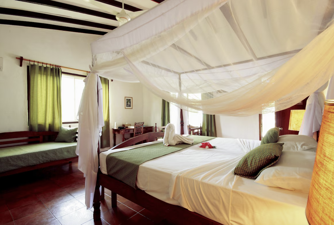 Le camere, tutte dotate di letto a baldacchino, telefono, frigobar, aria condizionata e ventilatore a soffitto, sono suddivise in varie tipologie: