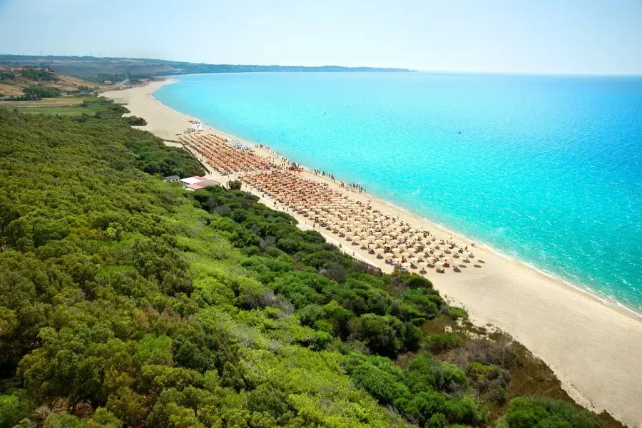 La spiaggia del Serenè Resort è un nastro di sabbia chiara che si stende per chilometri, a perdita d’occhio nell’azzurro del Mar Ionio.