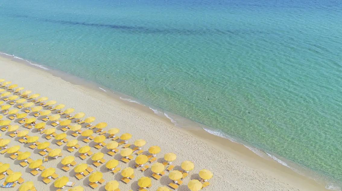 La lunga e ampia spiaggia di sabbia finissima, con concessione balneare privata e attrezzata con ombrellone e 2 lettini per camera.
