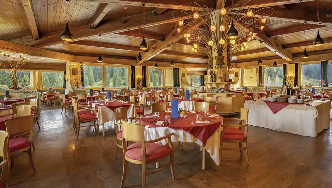 Il ristorante domina la piana di Campo Carlo Magno e propone un servizio al tavolo arricchito da un buffet di sfiziosità, crudità e dolci, con i piatti della tradizione locale e internazionale.