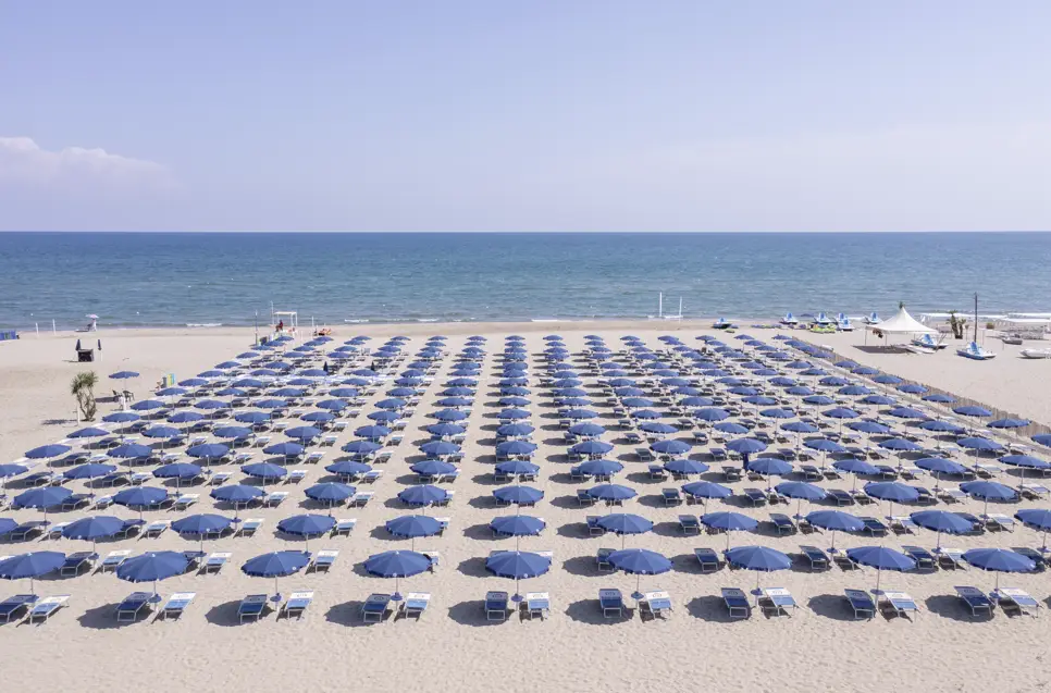 La spiaggia è ampia e di sabbia finissima; è privata e attrezzata con ombrelloni, lettini e piccolo punto ristoro. Si trova a circa 600 metri dal corpo centrale del villaggio ed è comodamente raggiungibile a piedi, lungo una stradina pedonale che attraversa la pineta, o con un simpatico trenino-navetta.