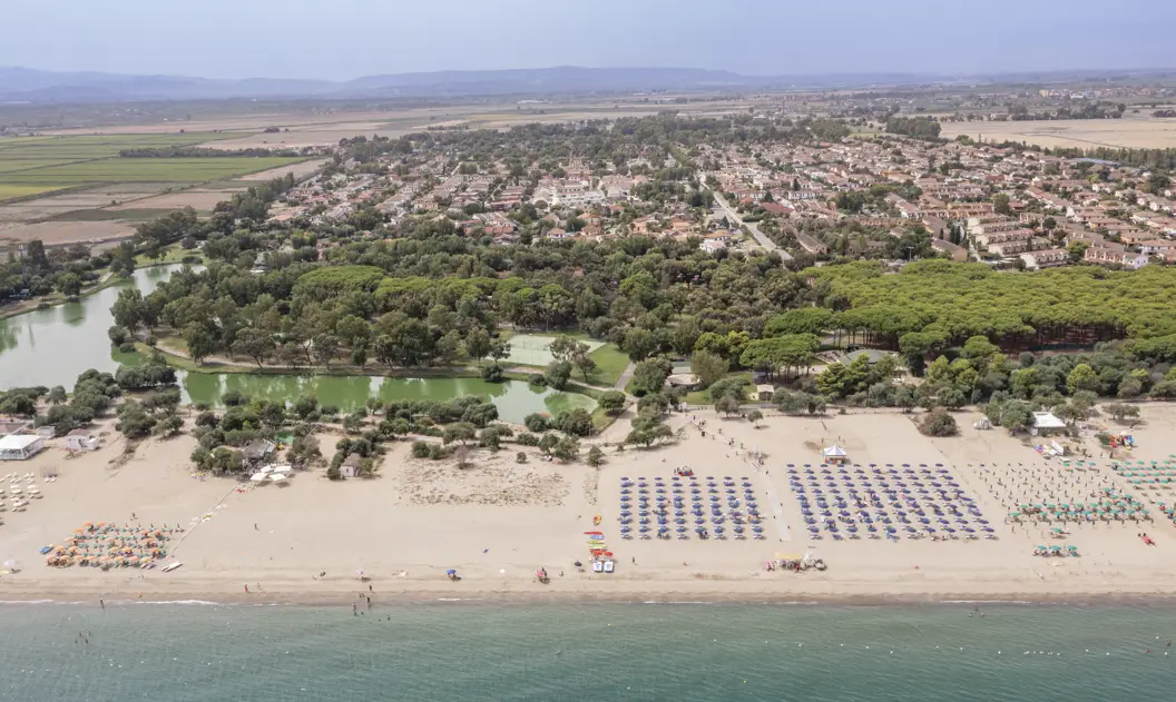 La lunga e curatissima spiaggia privata di sabbia si estende per quasi un ettaro. Si trova a 200/300 metri dai villini ed è raggiungibile tramite le stradine che attraversano la pineta del Villaggio. È attrezzata con ombrelloni e lettini, docce e servizi, beach bar.